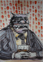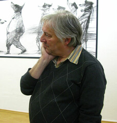 Die Palette der Emotionen reicht in Faragós Fall von Amüsement bis zu Betroffenheit. Amüsant kommen auf den ersten Blick zum Beispiel seine von Hunden dargestellten Flaneure auf dem „Boulevard der vornehmen Rasse" daher, die sich artig grüßen oder hochnäsig im Frack einherstolzieren. Die Szenerie wirkt jedoch umso bestürzender, je mehr man sie im Kontext der gesamten Ausstellung sieht. Wenn man sich beispielsweise bewusst macht, dass dieses Bild neben einer kleineren Zeichnung hängt, die aufeinander gestapelte Schuhe zeigt. „Übriggebliebene", heißt diese Arbeit. Diese Schuhe haben ehedem sicherlich nicht Vertretern der „vornehmen Rasse" gehört. Das Menetekel von Auschwitz wird hier aufgerufen, ohne es explizit zu zeigen.